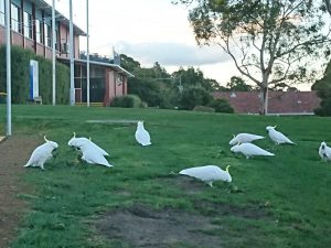 学校には沢山のオウムがいます。海の隣の美しい学校です。